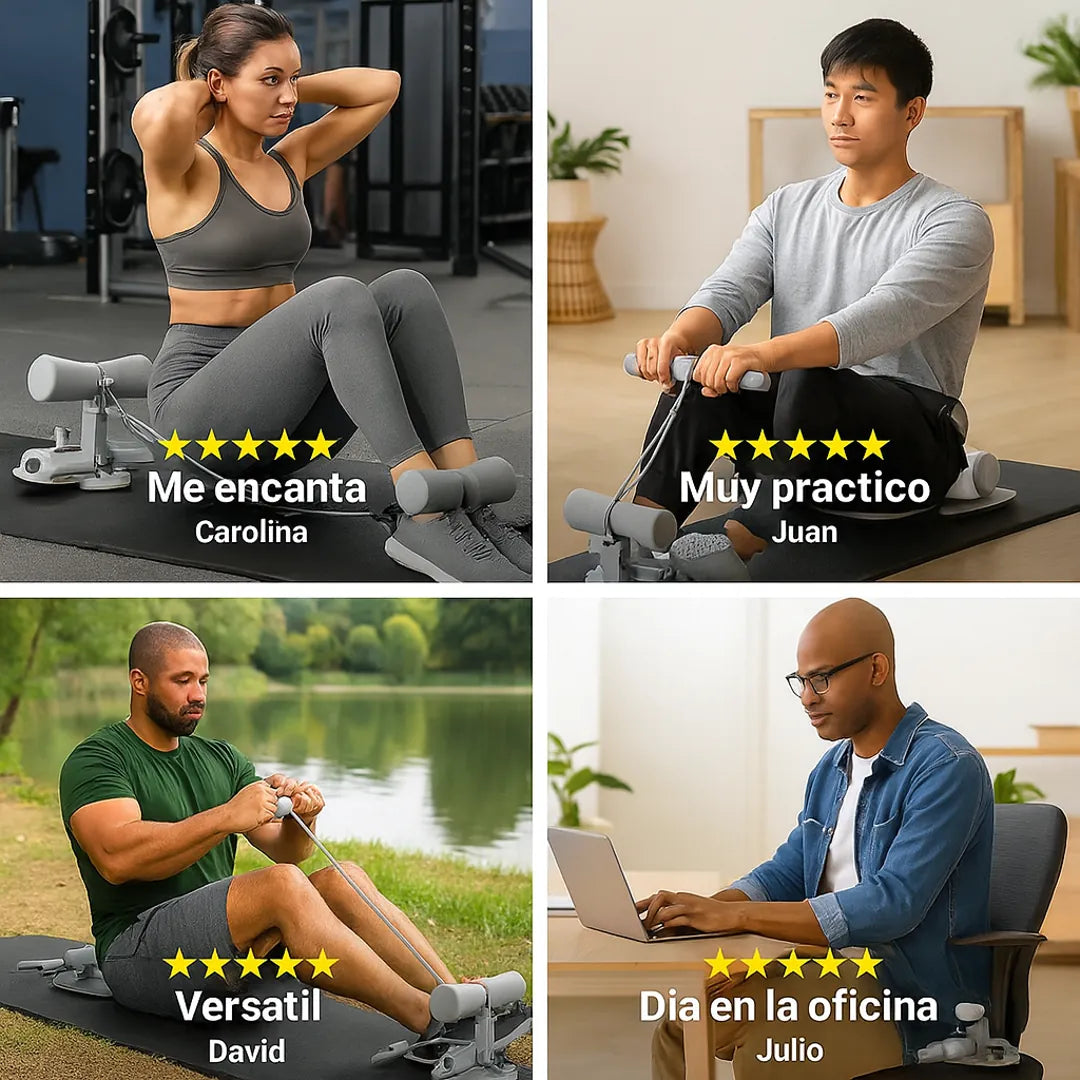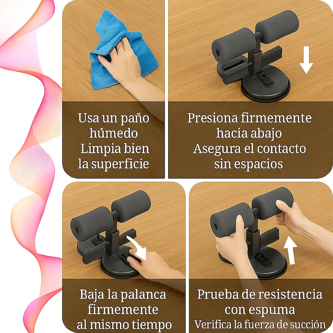 Asistente de abdominales con succión a presión y banda elástica. Ideal para rutinas de abdomen, core y tren superior en casa, sin máquinas grandes.